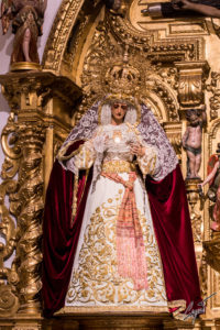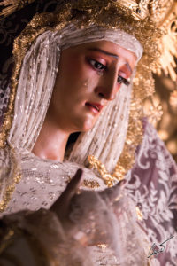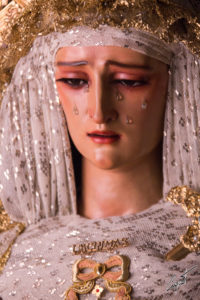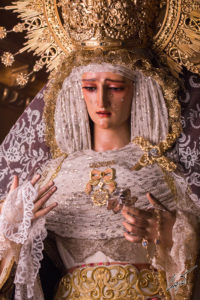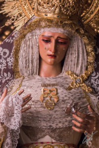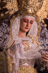 La Santísima Virgen luce en su pecho el broche ‘En cada Lágrima’, donado por un grupo de hermanos en recuerdo de los donantes y trasplantados de médula y enfermos oncohematológicos.