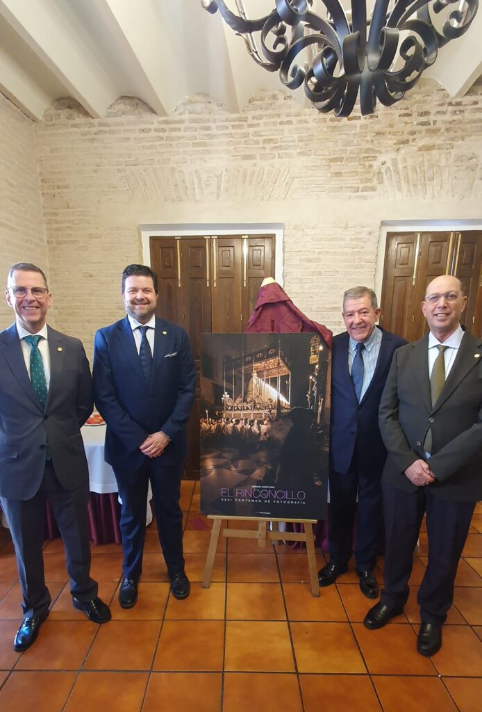 Ese mismo jueves tuvo lugar la presentación del Cartel 2026 de la Tertulia El Rinconcillo, acto al que asistieron nuestro Hermano Mayor, D. Pedro Avendaño, y nuestro Teniente de Hermano Mayor, D. Francisco José Marcos. La obra, realizada por Manuel Leal, representa a la Virgen de la Presentación de la Hermandad del Calvario.